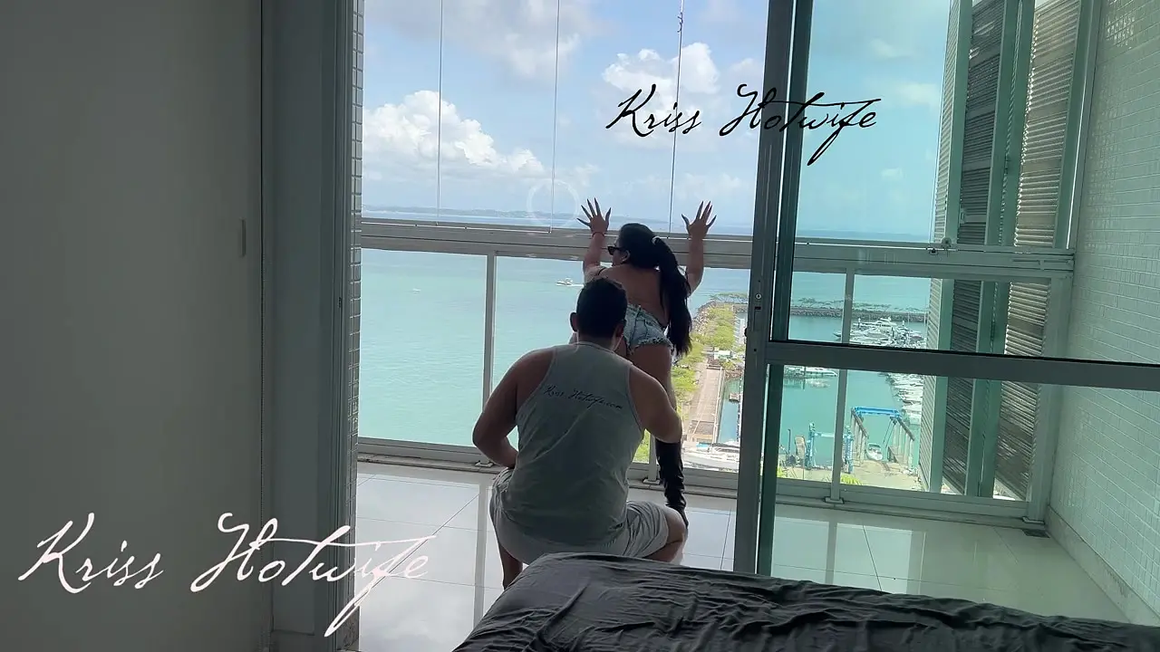 A sexy hotwife stands on her balcony in a revealing outfit, teasing the men swimming in the pool. Her husband films her as she flirts and shows off her body. The pool guys get excited, and she blows them kisses before her husband joins in for a threesome.