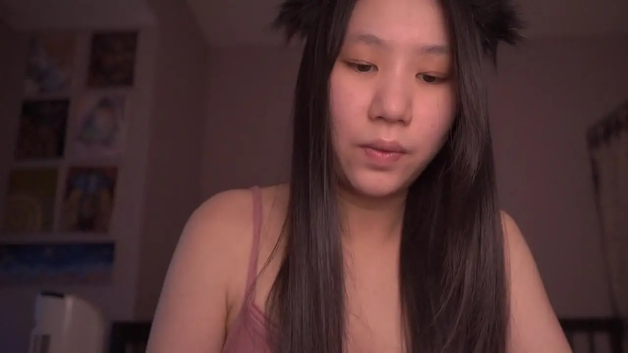 Cute Asian girl in Chinese cosplay plays the role of a fox girl. She sits in a cozy room and reads a story aloud softly, perfect for ASMR. Her innocent and adorable expressions will make you weak in the knees.