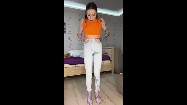 A mature and attractive milf finds herself desperate for a pee, but her tight blue jeans won't allow for a proper bathroom break. She moans and talks dirty as she pees herself, the sound of her wetting herself adding to her kinkiness. The warm urine soaks through her jeans, giving her an intense pleasure that she can't deny.