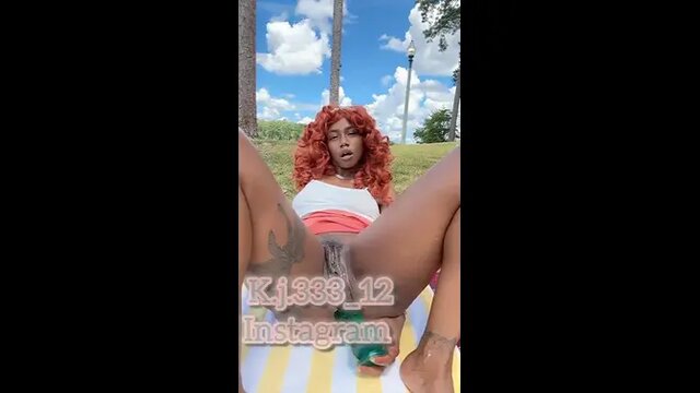 Kati, a gorgeous ebony girl with a huge booty, gets caught by her boyfriend while having anal sex in the park. He stuffs her ass full of his big rod, making it gape as she moans loudly. They finish with her getting a nice creampie in public.