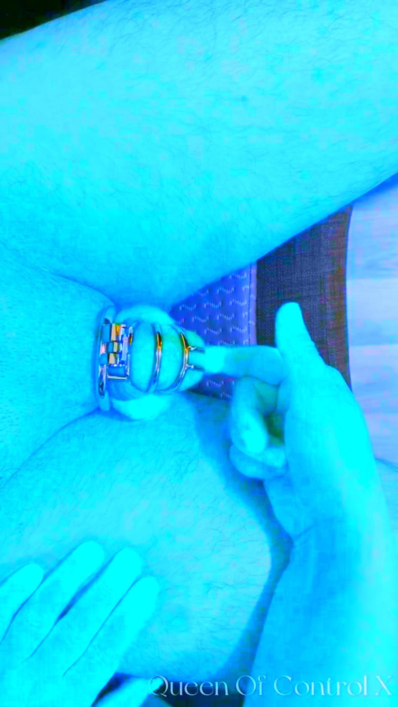 In a scene of female domination, a dominant woman teases her submissive slave with POV shots of his locked chastity cage. She denies him release and taunts him with toys, making him plead for relief. The tease ends with a surprise as she takes off the cage and devours his eager cock.