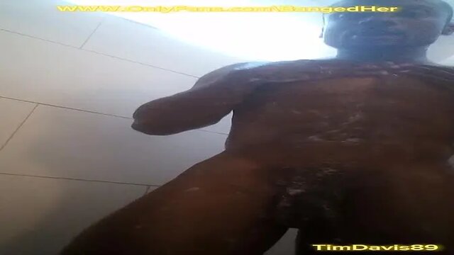 Big black cock in the shower - muscular guy wows with his uncut monster