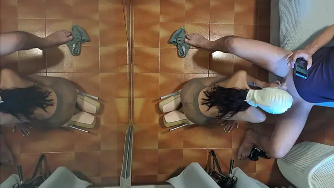 Milf in pantyhose and high heels gives a blowjob on her knees with cum swallowing