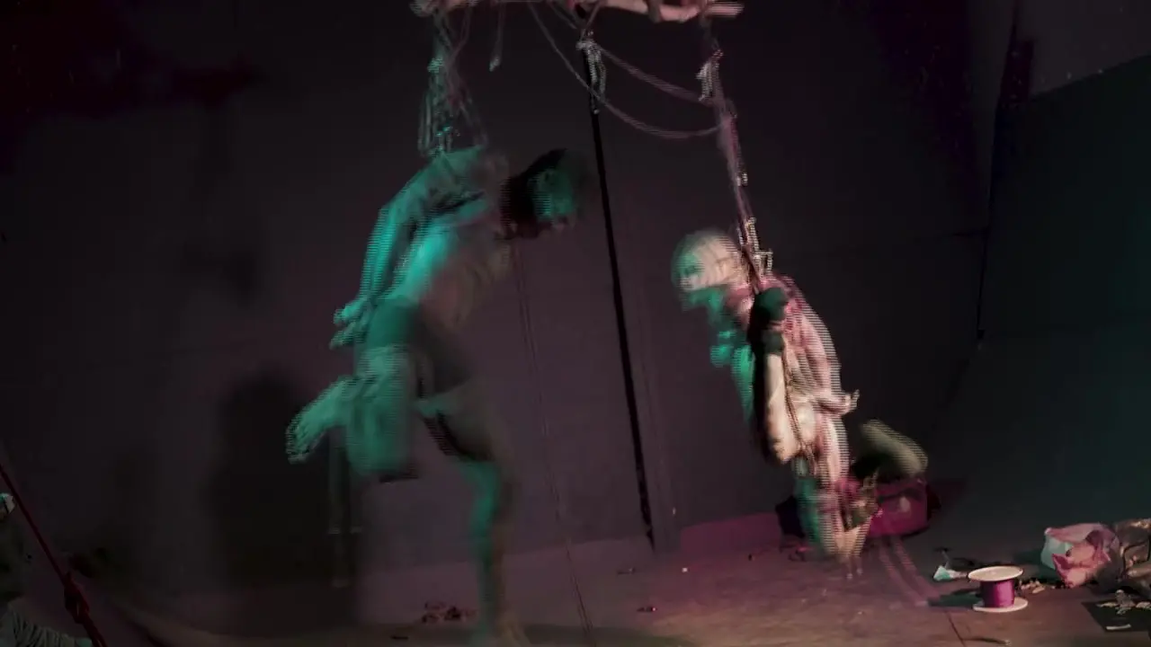 A blonde and a slim tattooed couple get hooked up with ropes and suspended from the ceiling. They're both petite with round asses. The camera captures their moans as they're pleasured together in their kinky shibari scene.