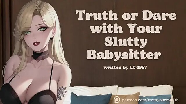 A sexy teen babysitter is playing Truth or Dare with her friends and decides to get naughty. She gives a sloppy blowjob with deepthroat and rides his cock in cowgirl. He breeds her hard and she cums, then she jacks herself off as they continue their dirty game.